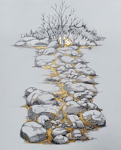 2021Pentekening met potlood ,oostindische inkt en goudverf. Deze is ingelijst te koop , maar mag niet met lijst op de site.